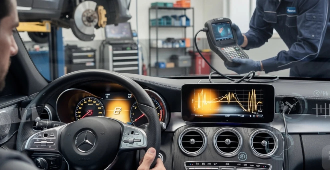 Professionele diagnose van een brandend ABS- of ESP-lampje op een Mercedes begint met uitlezen van de regeleenheden. Merkspecialisten gebruiken daarvoor Star Diagnosis / Xentry, universele garages vaak een merkgerichte tester zoals iCarsoft MB II. Een eenvoudige OBD2-scanner is meestal beperkt tot motormanagement en ziet ABS/ESP-codes niet of slechts gedeeltelijk.