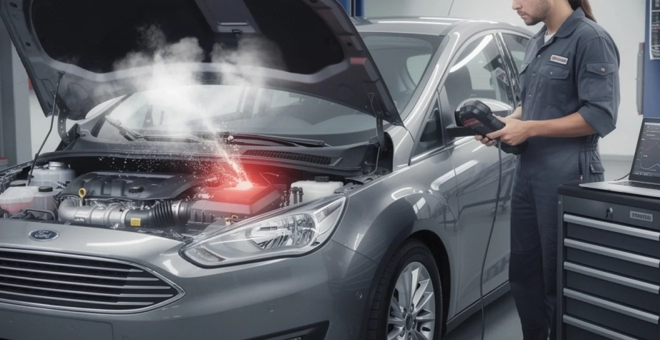Beginnende oververhitting bij de 1.0 EcoBoost laat zich herkennen aan subtiele signalen. Je ziet mogelijk incidenteel witte rook uit de uitlaat, vooral bij koude start, terwijl het koelvloeistofpeil geleidelijk daalt. In het interieur kun je een lichte koelvloeistofgeur bemerken bij stationair draaien. Bij stevig optrekken volgt soms een zacht “pingelend” geluid (milde knock) doordat de verbrandingstemperatuur stijgt en de ECU aan het corrigeren is.
